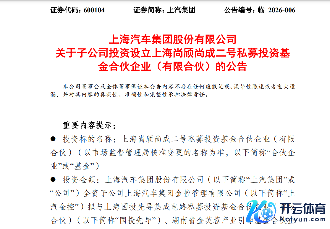 2月13日,上汽集团公告,公司全资子公司上汽金控拟与国投先导、湖南金芙蓉、国孚领航等企业共同出资设置上海尚颀尚成二号私募投资基金联合企业(有限联合),基金初度认缴范围为25亿元,其中上汽金控认缴10亿元。