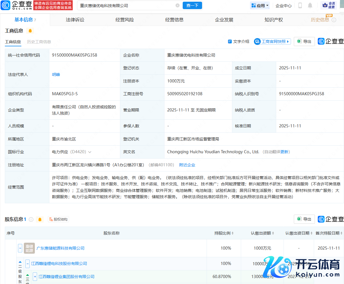 近日,重庆惠储优电科技有限公司建树,法定代表东说念主为胡峰,注册本钱为1000万元,打算畛域包含:供电业务;发电业务、输电业务、供(配)电业务;交易概括体惩办处事;电板销售;电板制造等。企查查股权穿透表示,该公司由赣锋锂业(002460)旗下广东惠储动力科技有限公司全资握股。