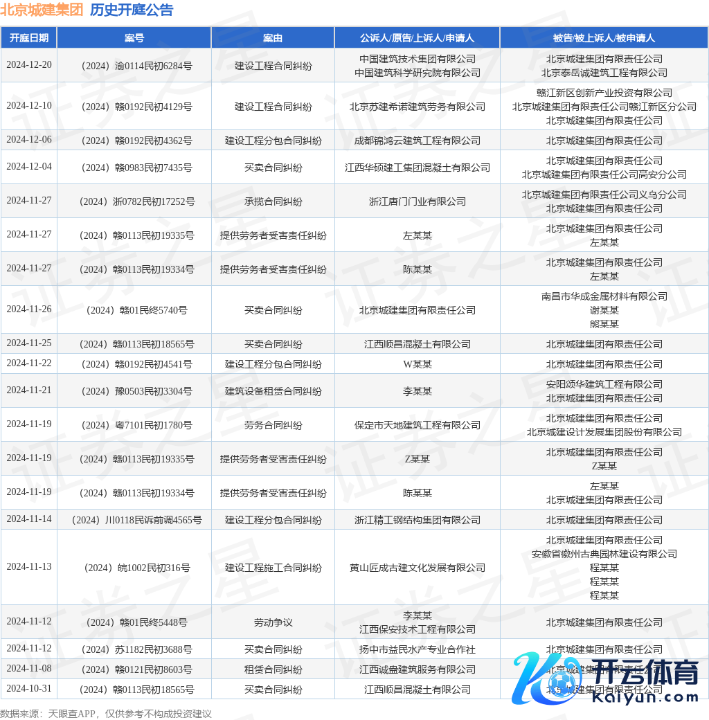案号:(2024)赣01民终5740号审理法院:江西省南昌市中级东说念主民法院案由:交易左券纠纷当事东说念主信息: 原告/上诉东说念主:北京城建集团有限牵扯公司 被告/被上诉东说念主:南昌市华成金属材料有限公司、谢某某、熊某某开庭日历:2024年11月26日字据统计,近一年内以北京城建集团有限牵扯公司为当事东说念主的历史开庭公告有205则,其中案由为“交易左券纠纷”的公告以48则居首,其次为“设立工程施工左券纠纷”有31则,“劳务左券纠纷”有28则。历史开庭公告(前20条)如下: