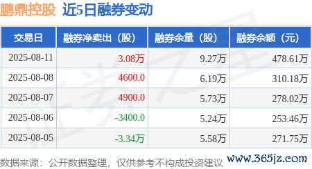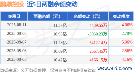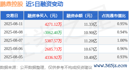 本站音书,8月11日,鹏鼎控股(002938)融资买入1.61亿元,融资偿还1.18亿元,融资净买入4271.12万元,融资余额11.33亿元。