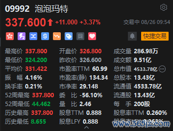 8月26日音书,泡泡玛特盘中拉升涨超3%,股价最高波及337.8港元,再创历史新高。铁心发文,泡泡玛特涨3.37%,报价337.6港元,成交额逾9.5亿港元。