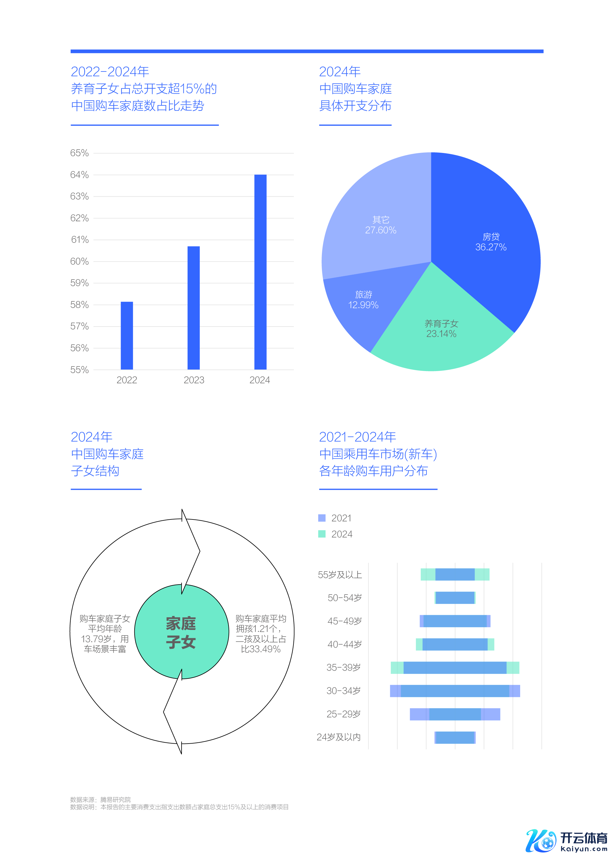 近几年,养育子女的开支权重进一步普及,2024年超64%中国购车家庭的养育子女开支占比杰出15%,养育子女占总开支的比例升至23.14%,仅次于第一掀开支房贷;诚然房贷长期位居中国购车家庭的第一开支地位,但近二十年中国购房以成婚为主,透支多数家庭金钱,容易稀释购车开支,压制车市的个性化、品性化等诉求,影响高质地发展。对比房贷,养育子女与购车的关系更紧密,波及高放学接送、周末补习接送、寒暑假自驾游等诸多需求。为了更好养育子女,家庭会更积极选购安妥的车型;
