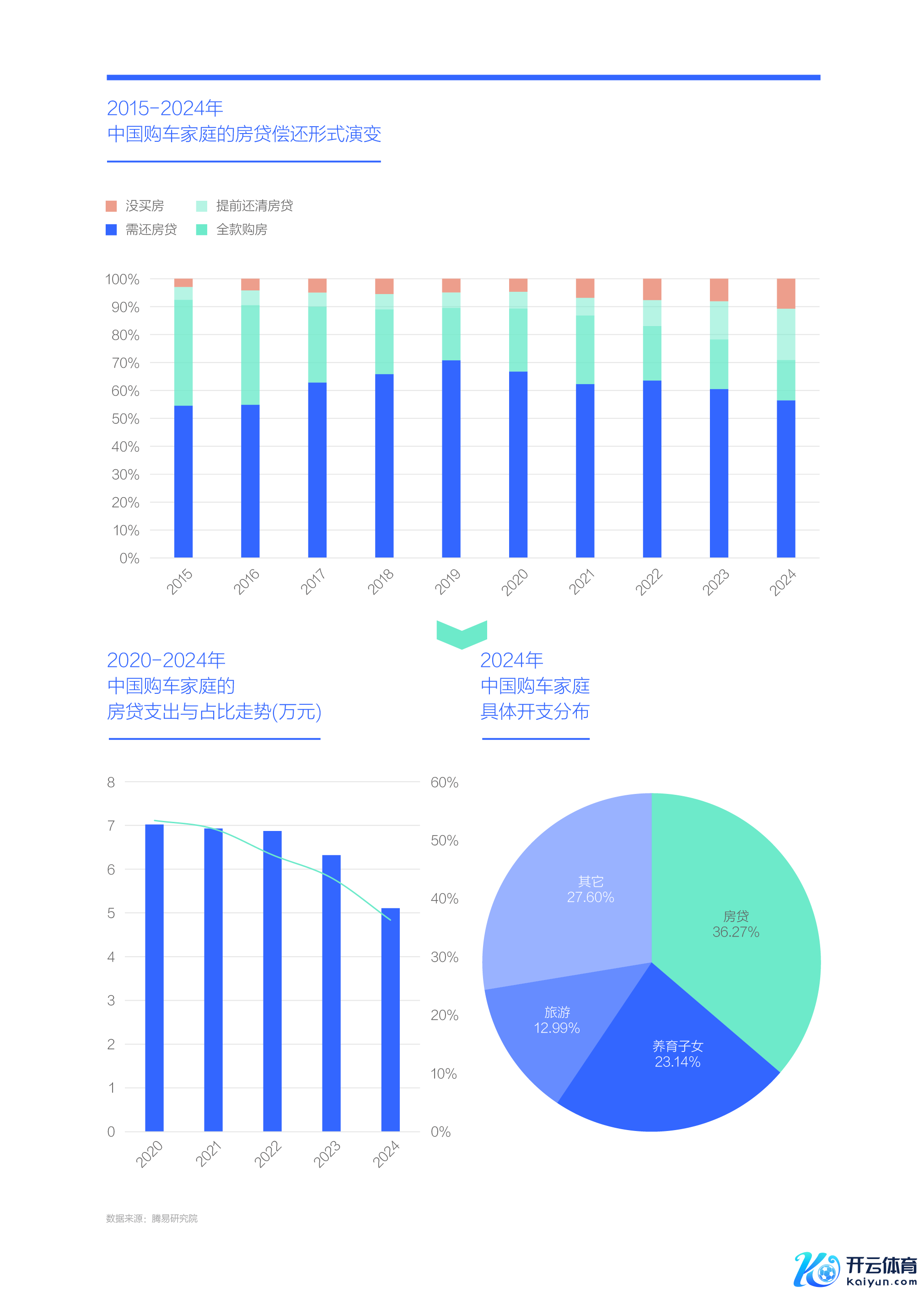 上述一系列变化共同镌汰了中国购车家庭的房贷压力,2020-2024年购车家庭的房贷开支由7万多降至5万多,房贷支拨占比由50%多快速降至40%以内。2024年,诚然房贷开支一经中国购车家庭的第一开支,占比36.27%,但比曾过程半的开支占比少了一大截;