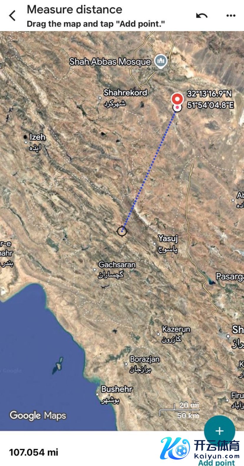 这个区域位于伊朗Kohgiluyeh and Boyer-Ahmad省的Dehdasht临近山区范围内,这个区域的中心坐标是30.85°N, 50.60°E,这个便是搜索区域的中心,距离扶助临时着陆点坐标:32.258394°N, 51.901927°E的距离是199公里!